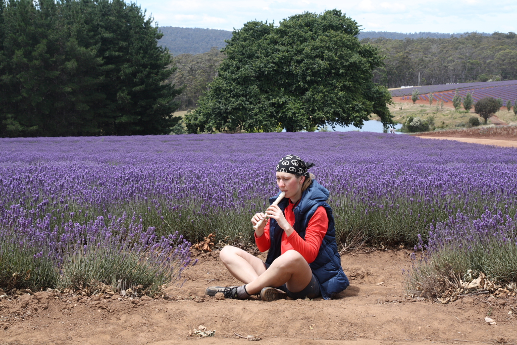 История этой лавандовой фермы началась в 20-х годах, когда на Тасманию прибыл парфюмер из Лондона, привез с собой семена лаванды с Альп французского Прованса, где они растут естественным образом на достаточно высоких широтах, и решил заняться бизнесом. Как видно, лаванды прижились на новой для них земле, и бизнес попер в гору. Сайт имения сообщал, что наилучшее время для посещения лавандовых полей — лето, с 1 декабря по 31 января, когда лаванды предстают во всей своей красе цветения. Сбор урожая начинается в конце января. Ах как мне повезло! От такого счастья я достала блок-флейту и устроила концерт в цветнике на радость японским туристам.