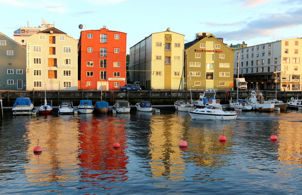 Романтика еще и в том, что лодка собирает пассажиров со всех многочисленных островов между Кристиансундом и Тронхеймом, и можно всеми этими островами полюбоваться через окошко. Так мы и доплыли до Тронхейма, по пути пожевывая сухую несоленую треску. Как только ее ели викинги! В Тронхейм прибыли на закате, и этот город сразу предстал перед нами во всей своей красе! Я влюбилась в него с первого взгляда.