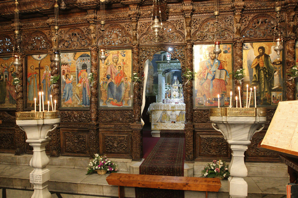 Русский священник в красном одеянии, держится рукой за резной стул. Остальные греки. Я никогда не обращала внимания на разницу в одежде священнослужителей разных конфессий, а здесь как нигде можно ее заметить.
