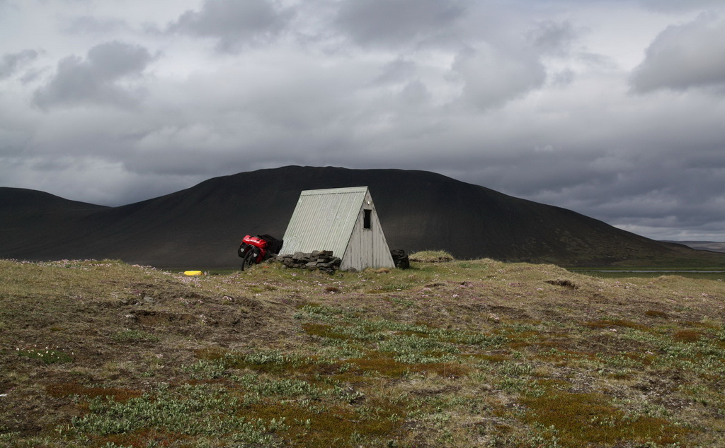 «Дынжа» — так прозвали мы сегодняшний пункт назначения — оказалась скрыта в ложбине между двумя невысокими грядами холмов, на берегу озера. Я разглядел крохотную точку в бинокль. Без бинокля и карты найти это место было бы сложно, особенно в непогоду. В озере, очевидно, пригодная для питья, или, как минимум, для скота, вода. Я всегда удивлялся, как исландцы, с викингских времён ухитрялись пасти скот в таких местах. Но — лето коротко, дорог каждый день. Выкормить скот, дать овцам пастбища, чтобы те, в свою очередь, поделились с людьми шерстью и мясом — тут и пары скрытых долин среди лавовых скал не пропустишь! В Дынже сохранились средневековые загоны для скота, обглоданный ветрами каменный схрон, на котором установлен крохотный домик высотой два метра. Тесное убежище для двух человек. Здесь можно выжить в непогоду.