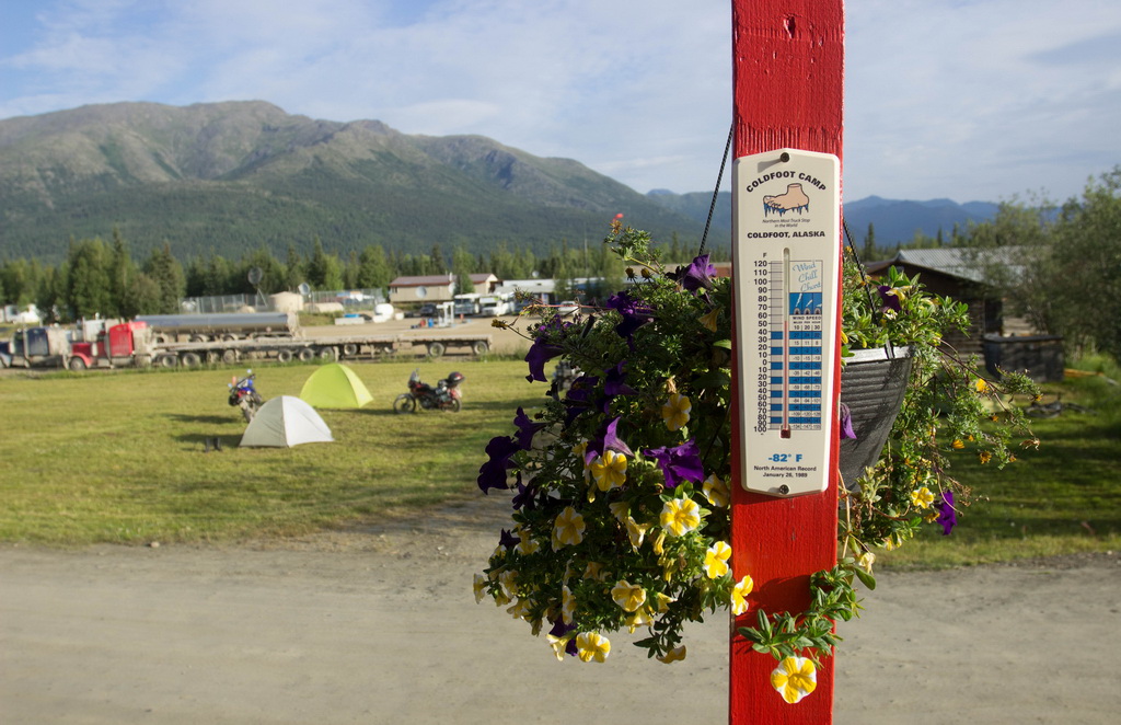 Колдфут (в буквальном переводе «холодная нога») представляет собой небольшой лагерь для отдыха дальнобойщиков. Он удобно расположен на середине пути между Фэрбенксом и Дэдхорсом: отсюда примерно 400 километров и до первого, и до второго. В былые времена лагерь прозвали так золотоискатели, отморозившие ноги в одну из суровых зим. Самая низкая зафиксированная здесь температура составила -82 градуса по Фаренгейту (-63 С). У гостиницы висит любопытный градусник с диапазоном от -100 до 120 по Фаренгейту. Из постоянного населения здесь всего 10 человек, остальной персонал работает вахтой. Здесь есть кафе, заправка и гостиница. Но магазина продуктового нет, так что не стоит рассчитывать на пополнение запасов. А еще здесь есть инфоцентр для туристов. Посреди арктической пустоты стоит туристический центр, оборудованный по последнему слову техники: все новое и современное, чучела снежного барса и белого зайца украшают главный зал. Здесь можно узнать погоду на перевале Атигун: ближайшие два дня вероятность дождя 80%. Ну что же, будем готовиться к худшему.