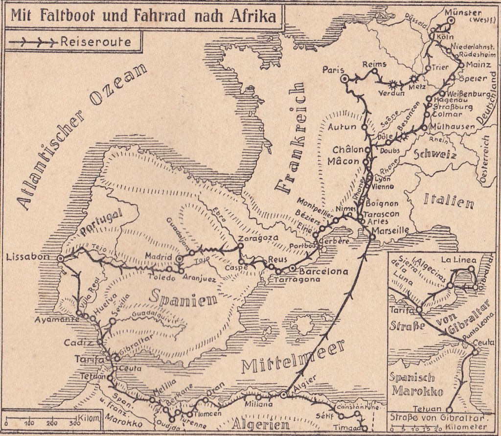 Итак, в путь! Весной 1927 года, стартовав в родном Мюнстере, велосипедист отправился в Майнц. Далее он пересекает округ Берн-Мительланд, доезжает до французского Безансона. Здесь Бернхард пересаживается на лодку, пакует на неё велосипед и сплавляется вниз по реке Ду, а затем по Роне до Арля.