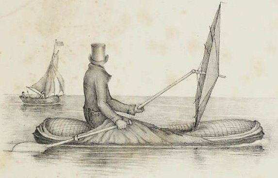 Еще в 1820 -40 гг. была разработана надувная спасательная лодка весом всего 5 килограмм! Её автором был британский морской лейтенант Питер Халкетт. Будучи участником полярных исследований в канадской Арктике, Халкетт загорелся идеей создания легкого и функционального снаряжения, способного выдержать экстремальные условия. Его идеи достаточно любопытны даже для нашего времени. К примеру, Халкеттом была изобретена разборная надувная лодка из ткани, пропитанной резиной. Разобранную лодку можно было надеть в качестве плаща, вёсла и парус использовать как трость и зонт соответственно. Тем не менее, его изобретение было забыто — офицеру так и не удалось убедить чиновников Британского Адмиралтейства в целесообразности внедрения своих изобретений и они были надолго забыты.