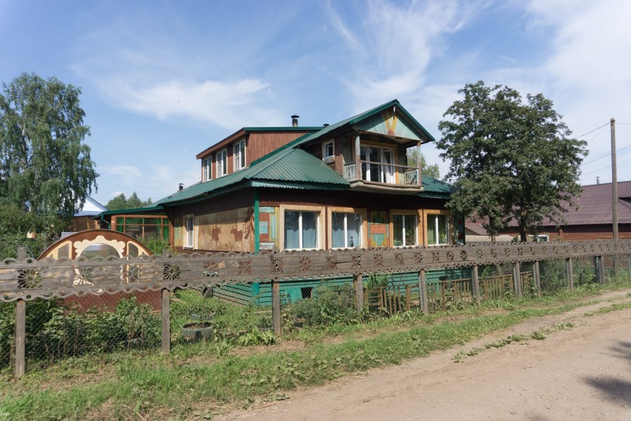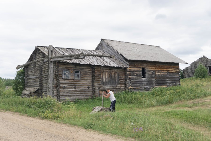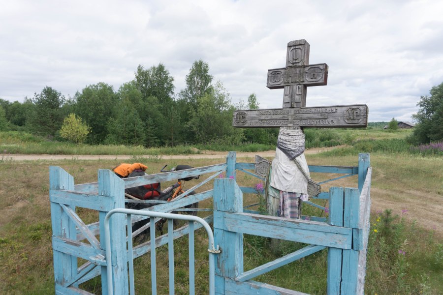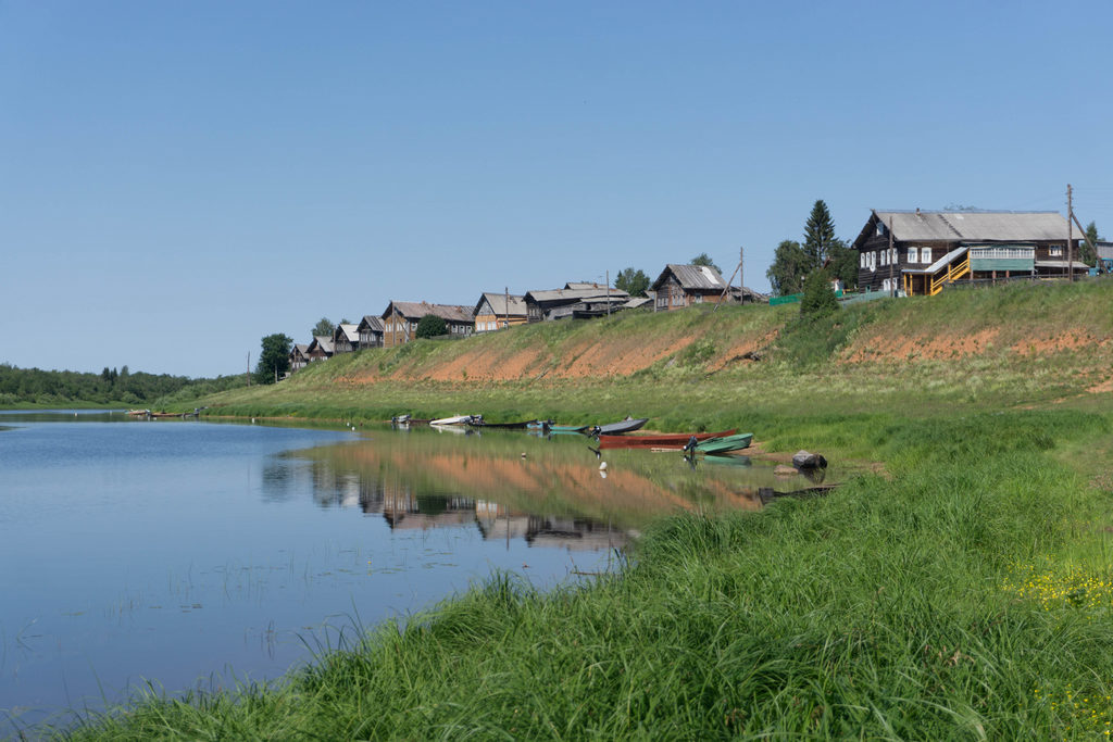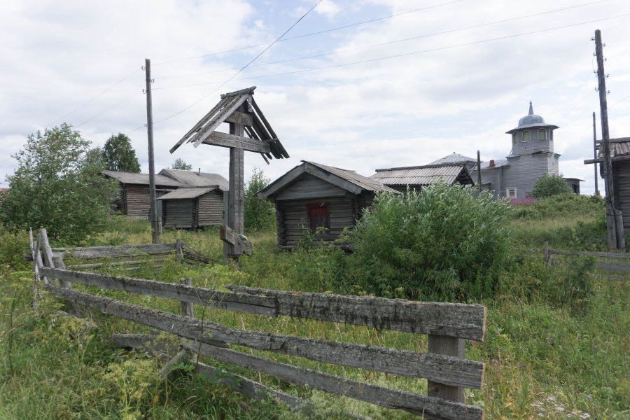 Мезень стала совсем мелкая, изрезанная множеством песчаных кос и островов. Захожу в протоку искупаться – а там и по колено нет, хоть что делай. Деревни пошли настолько маленькие и затерянные среди тайги и болот, что возникает ощущение какого-то отшельничества. Людей почти не видно, но заметно, что дворы очень даже обитаемые. И дома попадаются все больше старые, и старинные поклонные кресты сохранились, настоящие. Я такие деревни называю археологическими. Туристы в эти места добираются крайне редко, уклад жизни сохранился таежный, исконный. Это уже не лощеная Кимжа, а настоящая глубинная деревенская жизнь. В Селище жил мастер по палащельской росписи Фатьянов Иван Степанович, делал короба из бересты и шкатулки, те самые со знаменитыми красно-черными лошадками.