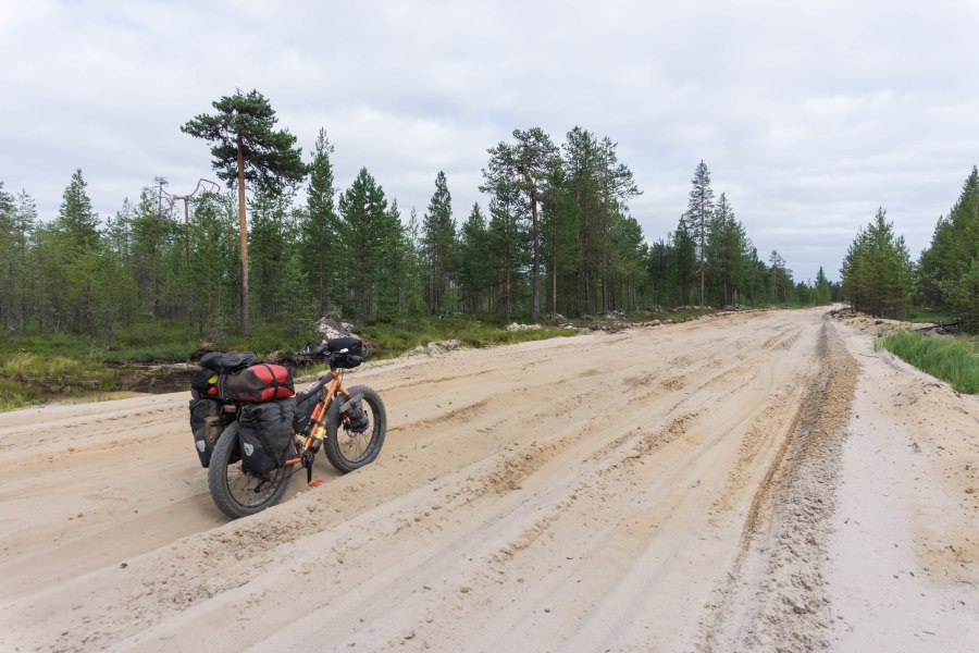 Где-то среди болот, когда до ближайшей деревни Кимжа оставалось около 100 километров, я заметила, что задняя покрышка стёрлась. Конечно, я и раньше наблюдала, как плохие дороги медленно убивают протектор, но сейчас пупырки сошли окончательно и вроде даже на их месте образовались ямки. У меня началась паранойя. А самовнушение и паранойя — страшные вещи. Сразу начинает казаться, что до конца дня эта покрышка уж точно не доживет. Теперь все время останавливаешься, впиваешься пристальным взглядом в колесо, выбираешь дорогу получше среди пыльной сыпухи. Едешь по краю, тонкой девственной полосе, оставшейся от когда-то прошедшего грейдера. «Стоп!» — сказала я себе. Так дело не пойдет. Вечером поменяю переднюю и заднюю местами и покачу дальше.