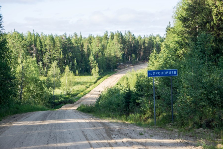 Дорога от Кимжи до Лешуконского далась мне тяжело и заняла два дня. Сильная жара выше 30-ти градусов, атака кусачих назойливых мух, которые все время роились вокруг, и отдыхала от них я только в палатке. А еще пошел неприятный рельеф. Берег изрезан мелкими ручьями, впадающими в Мезень, и они промыли довольно глубокие овраги. Дорога то резко спускается в низину, то резко поднимается из нее. Градиенты какие-то совершенно убийственные, под 12-15%. Много втаскивала велосипед пешком. А ближе к Лешуконскому начался участок дорожного ремонта. Туда-сюда ездили Камазы с гравием и песком, пыль столбом с дороги не уходила и не рассасывалась. Но вот наконец показалась понтонная переправа. Последний рывок, последний крутой подъем – и я в Лешуконском! Наконец-то мягкая кровать и холодный душ.