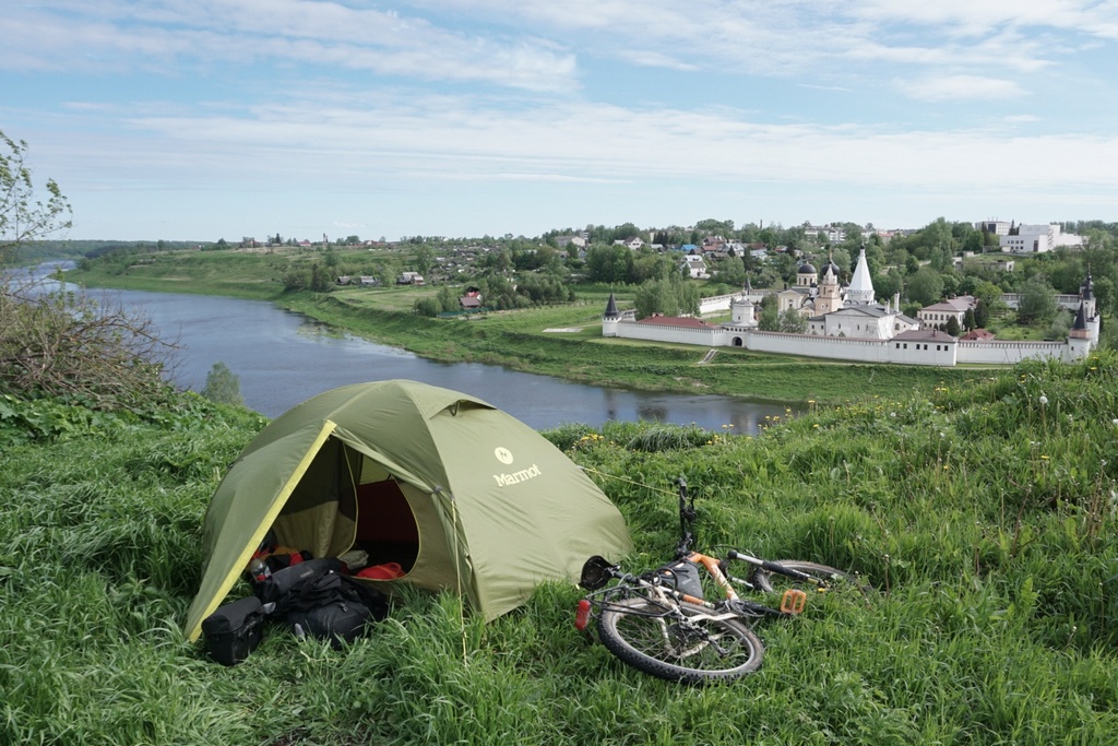 В Старице я поставила палатку на высоком берегу Волги с шикарным видом на Свято-Успенский монастырь и бесконечную реку. Только место было очень ветреное и ставить пришлось под сильным дождём, палатка так и норовила улететь в Волгу. Чувствую себя как альпинист на скале, ветер полощет тент, а я уже внутри в тепле завариваю чай. Не могу поверить в то, что доехала из дома аж до самой Волги. На сдутом коврике, оказывается, тоже можно спать. Только холодно, твёрдо и спина побаливает утром. Зато этот дырявый коврик и спальник — островок сухости и тепла в этом холодном мире.