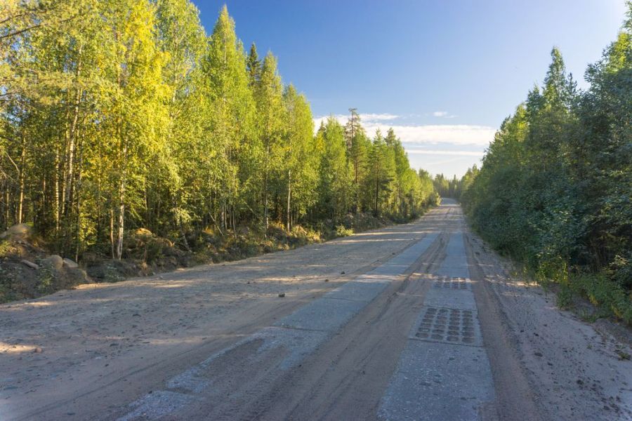 На одной стороне остатки старых бетонных плит с торчащей арматурой, выложенных в две полосы под колеса, с другой — песок да камни. Это старая технологическая лесовозка. Да и сейчас она используется в основном лесовозами и самосвалами – возят песок и гравий. Знающие люди стараются вообще по ней не ездить. Пыль стоит столбом, жара и безветрие – оседает все это долго и медленно. Хорошо сегодня суббота, и самосвалов не так много. В будни здесь лучше на велосипеде не ехать. Но что ни сделаешь ради исследования новых мест и путей-дорог.