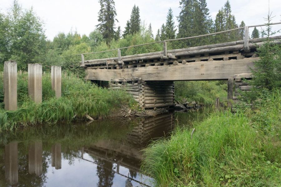 Дорога через Маложму чрезвычайно скучная, изобилует крутыми подъемами и спусками. Даже рассказывать о ней нечего. Сама деревенька Маложма приткнулась на крутом склоне реки. А через речку большой ряжевый мост. Эти мосты на северных реках здесь, пожалуй, единственная достопримечательность. Иногда в лес отходят какие-то полузаросшие колейки, ведущие к старым делянкам. В советские годы в этом районе активно рубили лес, а сейчас окрестные поселки лесорубов медленно вымирают.