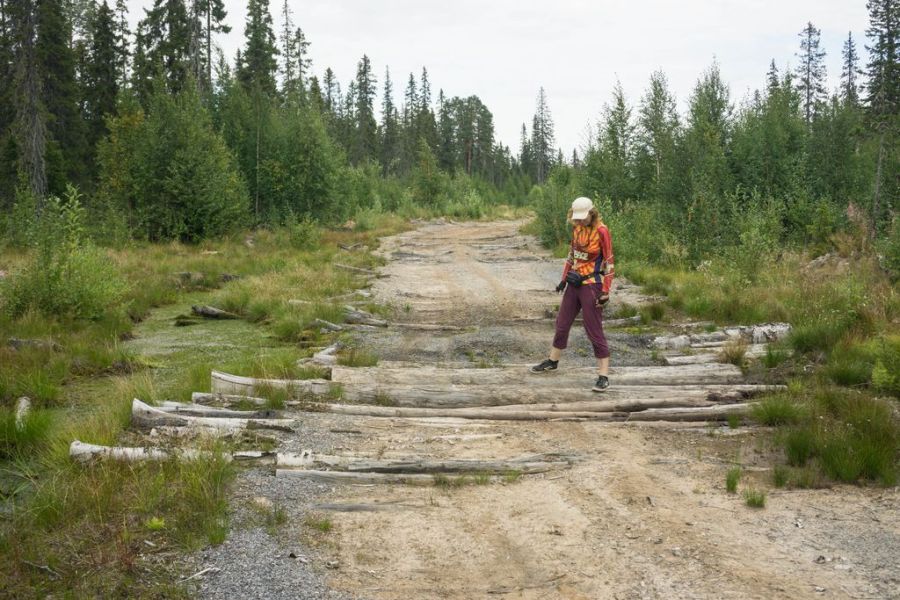 Вот и первый указатель на Пурнему. Известно, что пару лет назад до деревни отсыпали хорошую дорогу, до этого был только зимник через Нижмозеро. Но что я вижу: по указателю в сторону моря отходит лежневка. Начало многообещающее, но из следов на ней только след квадроцикла. Как-то подозрительно. Понятно, что дорога не основная, да и лежневка – это слишком непонятно для «хорошей круглогодичной дороги». Хотя в Архангельской области вообще ничему нельзя удивляться и картам никаким верить нельзя. Дороги между деревнями и поселками тут могут быть абсолютно любыми. Но если квадрик проехал, то наверняка проеду и я. Ведь должна же эта дорога выходить дальше в Пурнему. Решила рискнуть. Километра через два хорошая лежневка стала сильно хуже, свернула куда-то в сторону от нужного направления, туда же по ней уходил и квадро-след. А в сторону Пурнемы продолжались заросшие буераки через старую вырубку – дороги нет. Ну в болотные приключения пока рано ввязываться, ведь я же еще даже не добралась до Онежского берега! Пришлось вернуться.