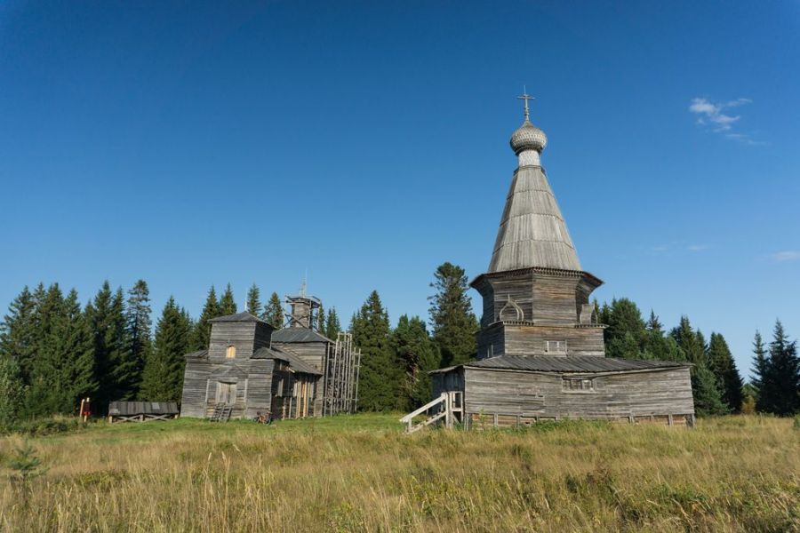 Паша проводит мне экскурсию по церквям. Их здесь оказывается две. Самая старая, главная святыня и древность – шатровая Никольская церковь 17 века, закрыта на пудовый замок. Это старейшее деревянное строение на всем Онежском полуострове. Освященная в 1618 году, она стоит на фундаменте из природных валунов на опушке леса. Второй храм, более поздний (1860 года), весь в лесах будто в шрамах. Строили ее как зимний теплый храм. Открыт, внутри идет мощная реставрация, а скорее даже консервация. Церковь в очень плохом состоянии, внутри ничего не сохранилось.