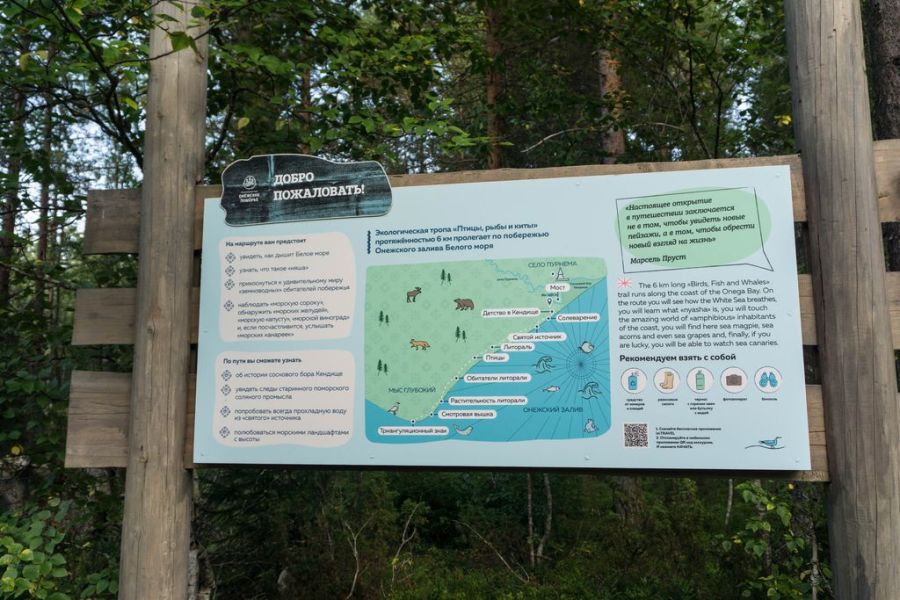 Егерь посоветовал мне переночевать возле родника в полутора километрах от деревни, который называют холодничок. Но для начала мне нужно найти мостик через Пурнему и спуститься к морю. Еле заметная полевая дорога ведет к хорошему мосту. За ним начинается хорошо оборудованная экотропа длиною в 6 километров. Берег хорошо обустроен, сделаны прекрасные информационные стенды и беседки. Стенды рассказывают о соляном промысле, об экосистеме Белого моря, о жизни поморов. Национальный парк образовался совсем недавно, а уже сделано кое-что для туристов.