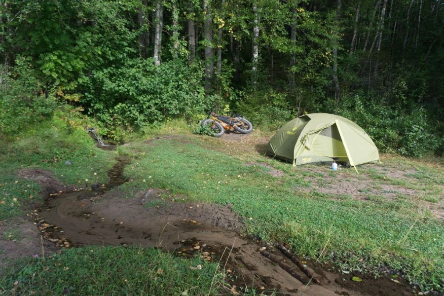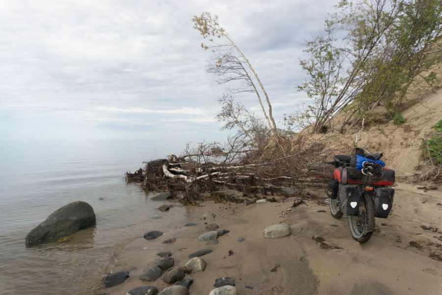 Но проснулась в 6 утра еще до будильника. Ночью опять прошел дождь. Спала очень плохо, все время просыпалась и переживала, как поеду дальше, успею ли пройти все сложные места до прилива. Больше 20-ти километров впереди берег заболочен, а самые опасные места со злой няшей находятся в устьях Паловы и Каменного. Джиперы писали о том, что к берегу прижиматься ни в коем случае нельзя – везде вязко. Немало застряло там всякой техники. В широком устье Паловы находятся седуны, способные затянуть машину чуть ли не целиком. И снились мне разные ужасы, как меня засасывает по пояс вместе с велосипедом, и я чудом выбираюсь, жертвуя при этом фэтом. В бессилии перед мощной стихией я наблюдаю, как моего стального друга заливает наступающее море…