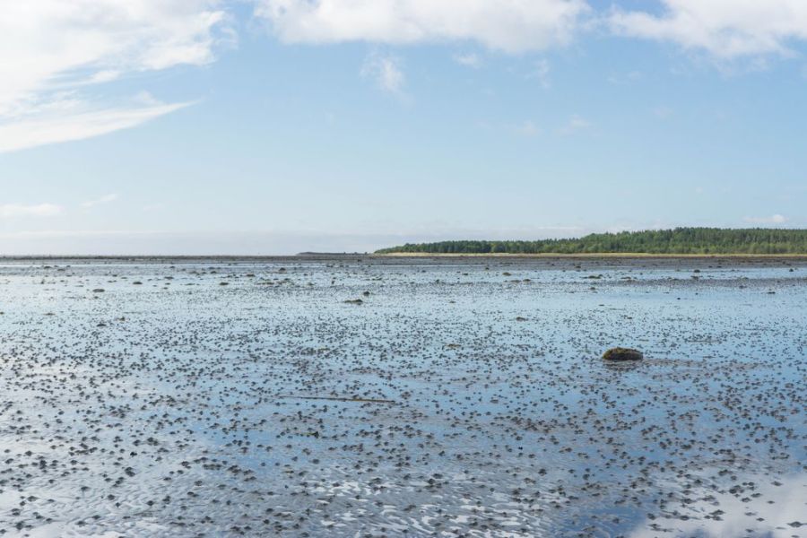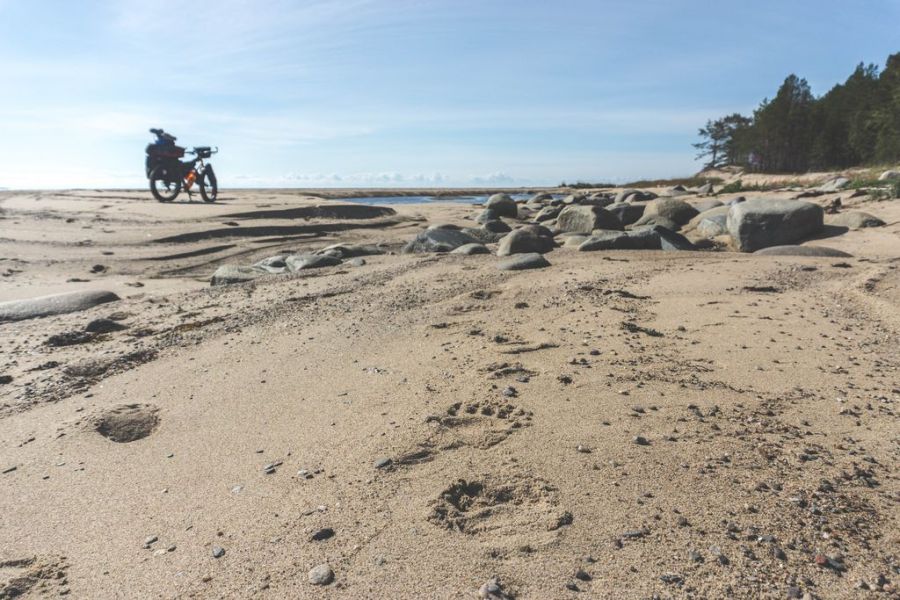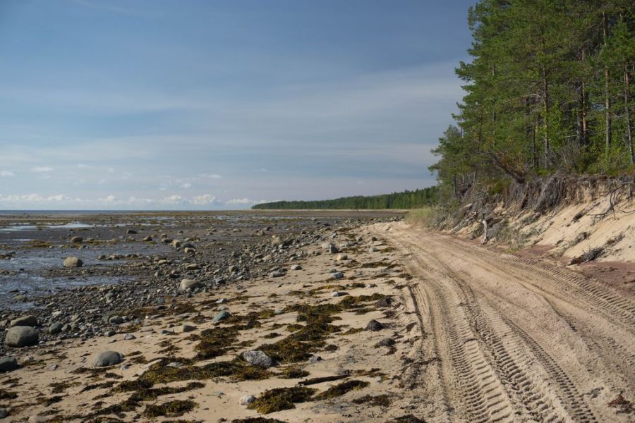 От Пурнемы до Лямцы нет дороги в привычном смысле. Зачем дорога, если берег здесь ровный и песчаный, и вот уже несколько сотен лет это единственный путь в деревню. Ехать лучше всего в отлив, когда вода отступает и открывает широкую мелководную литораль — лėщадь. Теперь моя жизнь на Онежском берегу находится в полной власти моря, его дыхания — большой и малой воды. Момент, когда море открывает дорогу вперед, появляется два раза в сутки. Сегодня первый отлив приходится на полдень, а второй выпадает за полночь. Каждый день он смещается примерно на полчаса естественным образом, и в разных местах на берегу он тоже происходит в разное время. Где-то море уже отступило, а где-то лагуны еще остаются наполненными соленой водой. Где-то оно уходит на километр от берега, а в другом месте открывает лишь узкую полоску камней-обливников. Ночи в августе уже темные, поэтому использовать я могу только дневной отлив. Отныне у меня есть единственное окно для движения в 3-4 часа в день. Сколько можно успеть проехать за это время?