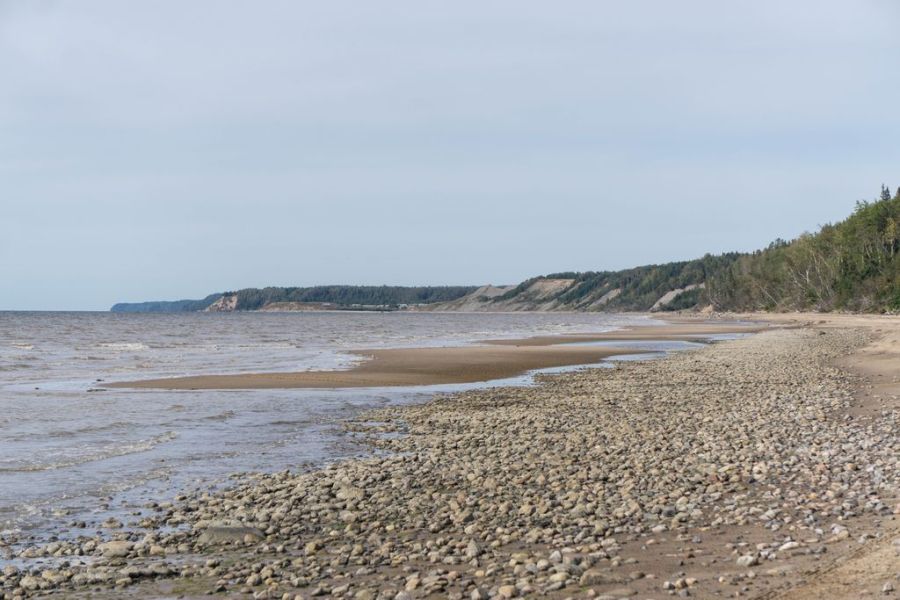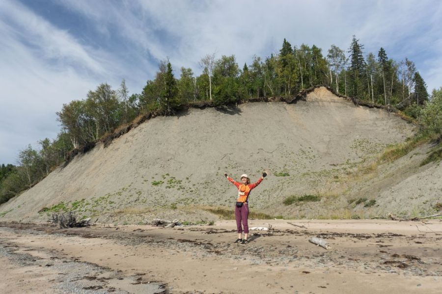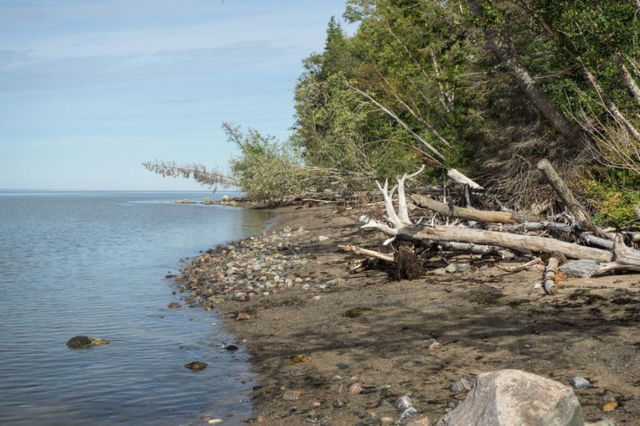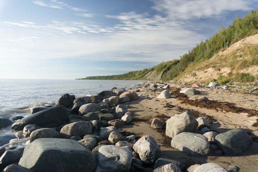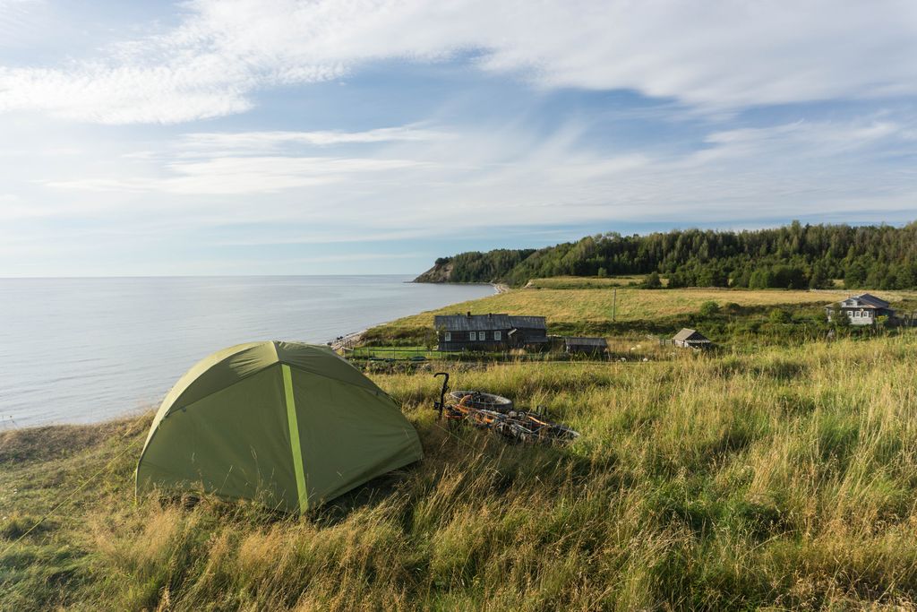 Пока я гуляла по деревне, море совсем подступило. За Лямцей берег действительно становится хуже – крутой и узкий, со множеством крупных камней и упавших в воду деревьев. И если от Пурнемы до Лямцы худо-бедно можно доехать в любое время, даже во время прилива протащиться по глубокому песку, то дальше по большой воде пути нет совсем. Я поставила палатку на самом высоком месте на утесе и решила прогуляться на разведку, а заодно и поискать родник. Вода в Лямце соленая. Уже через пару километров я уперлась в первый каменистый прижим и не смогла пройти дальше.