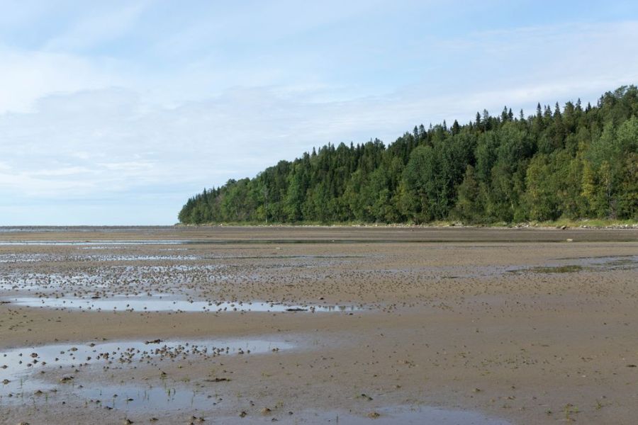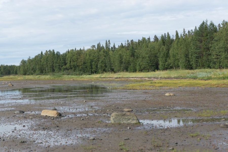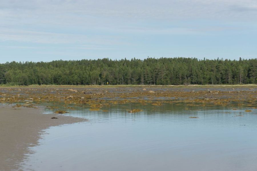 Казалось, самое сложное осталось позади. За Палова пытаюсь прижаться к берегу, но няша не пускает меня. Полоса берега метров в 300 полностью покрыта водорослями до самого горизонта. И опытным путем я понимаю, что водоросли как раз растут на самом вязком, что туда ехать сейчас не стоит. По своей сути это заболоченный берег, который незримо переходит в гигантскую топкую литораль. Я оказываюсь отрезанной от берега этими дурацкими водорослями. Пока получается только нестерпимо медленно двигаться вперед и надеяться на лучшее. Что успею до прилива пройти эти неприятные места и найти удобное место для выхода на твердую землю. Да, Онежский берег не дает расслабиться! Сейчас пытаешься использовать каждую минуту, чтобы продвинуться вперед. Фотографирую мало – велосипед не бросишь, не остановишься ради красивого кадра. Да и виды все какие-то однообразные.