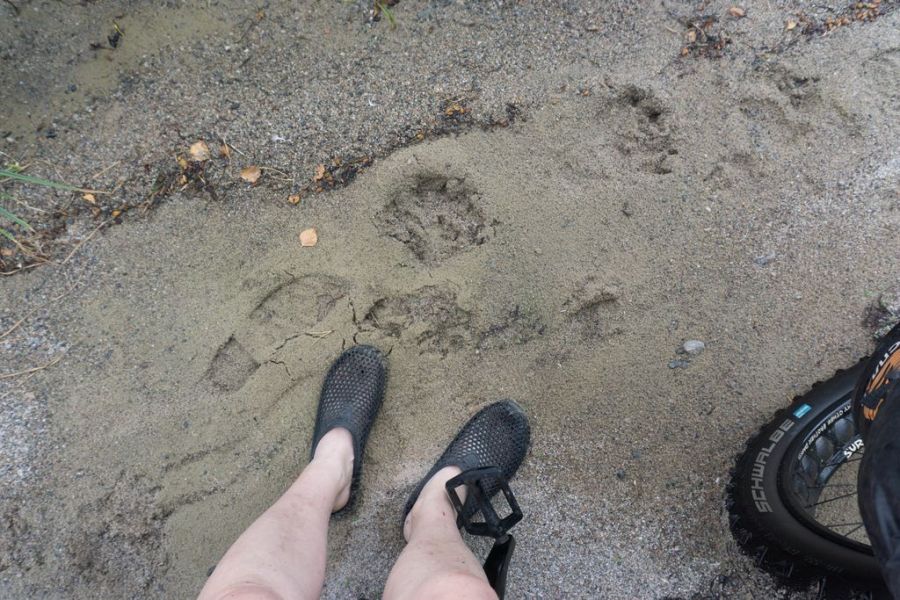 На песчаной полосе появились медвежьи следы. Мишка шел мне навстречу, так что столкнуться с ним вряд ли удастся. Но ехать здесь опять не получается. Полоска настолько узкая и завалена плавником и всяким мусором, что едва удается поместиться на ней рядом с велосипедом. Накрапывает мелкий дождь, а до избы остается еще километр. Я ужасно вымоталась, шла на адреналине и признаться, весьма рассчитывала на эту избушку. Что если уж и не переночевать в ней, то хотя бы укрыться от начавшегося дождя, перевести дух. Хотя ладно, чего себе врать. Я рассчитывала в ней переночевать. Это было бы здорово, очень круто! Изба… ну где же изба.