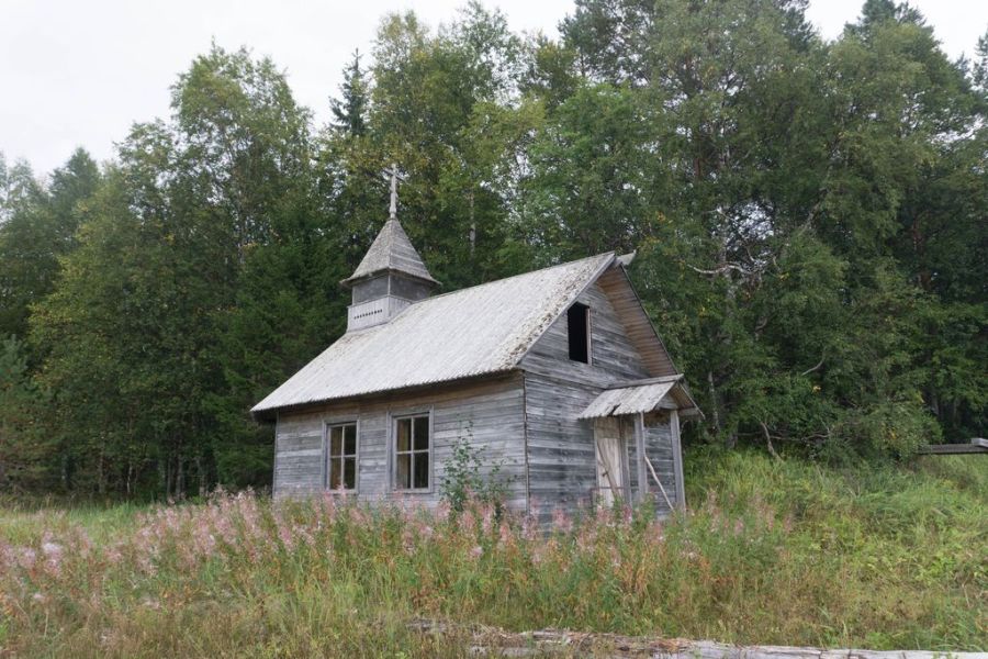 Вода почти заполнила литораль, но где по воде, а где по раскисшей няше я шлепаю дальше. Обхожу небольшие болотинки, пересекаю ручьи. По берегу тянутся уже не только медвежьи, но и свежие собачьи, и человеческие следы. Значит в Котово кто-то живет. Преодолев несколько болотин, выхожу на берег и вижу, что тропинка уходит в лес. Человеческая ли она? По узенькой тропе пробираюсь сквозь чащу и натыкаюсь на висящие сети. На берегу стоит часовня. Свежесрубленная, но какая-то пустая и недоделанная. Внутри ни одной иконы, даже ручки на двери нет и уже кто-то разбил окно. В случае плохой погоды здесь, наверное, можно укрыться и переночевать. Рядом с часовней упавший старый поклонный крест.