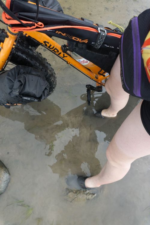 Приходится уходить все дальше от берега. Дно заставляет держаться мористее, но даже там колеса начинают вязнуть. В буквальном смысле теряешь землю под ногами. Ехать становится сложнее, пытаюсь подобрать правильную передачу. Если поставить слишком низкую, то колеса не провернешь, а на самой высокой они проскальзывают и погружаются еще глубже – няша эта еще и скользкая. Медлить нельзя, нужно постоянно находиться в движении, не терять скорости. Стравливаю давление, становится лучше. Пешком идти вообще неудобно – тапки засасывает похуже, чем колеса, они постоянно слетают и остаются в жиже.