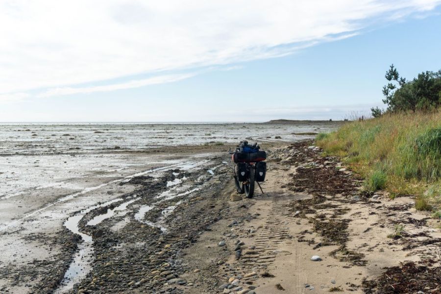 Вездеход скрывается за горизонтом, и я, смазав цепь, выезжаю на литораль. Воды еще много, сантиметров 10, она только стала отступать. Так что еду прямо по соленой воде, рассекая ее передним колесом. Буквально плыву. Довольно странное ощущение, а со стороны это наверняка выглядит очень забавно. Велосипедист, едущий прямо по морю. Чудеса, да и только.