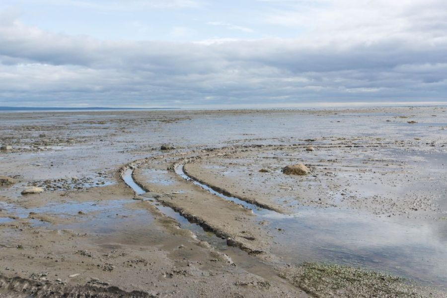 Для пика малой воды есть у поморов специальное слово — кỳйпога. Если куйпога в полдень, то выезжать можно уже за пару часов. Пока собиралась, медитировала на берегу и сушила палатку после ночного дождя, собралась только к 11-ти. Зато не пришлось нигде объезжать лагуны, открылся путь сразу по широким бескрайним просторам. Поначалу ехать не совсем привычно. Пытаешься ловить эту границу между няшей и песком. Там, где песок уже мокрый и плотный, но еще не перешел в вязкую илистую массу, ехать легче всего. Но даже на фэтбайке приходится прилагать некоторые усилия, чтобы поддерживать скорость выше пешеходной. Конечно, без груза ехать было бы значительно легче и быстрее. Каждый лишний килограмм на песке значительно тебя тормозит.