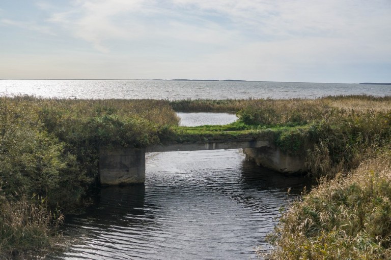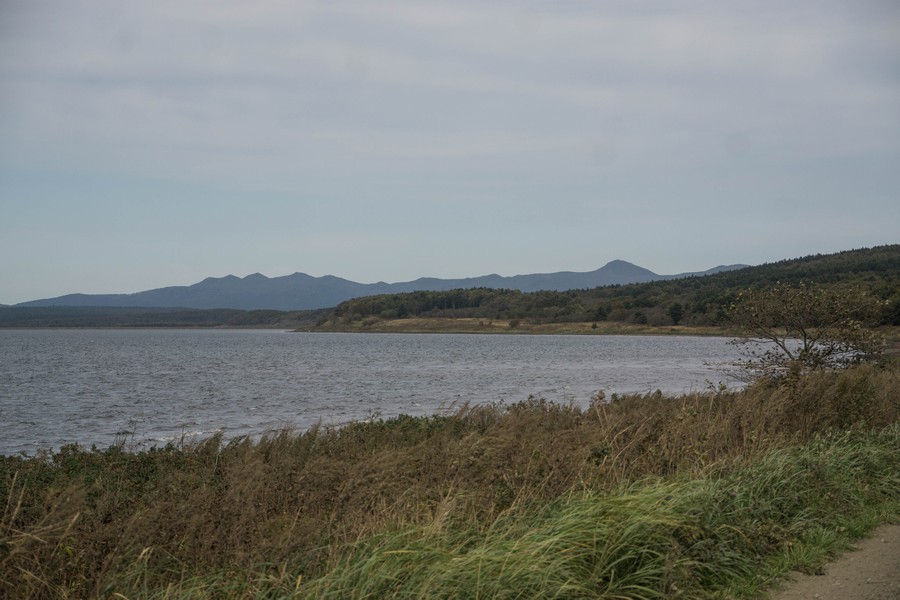 Сегодняшний путь вел нас вдоль озера Буссе. Пыльная дорога ничем не примечательна, а соленая лагуна хоть и живописна, но особо не отличается от других лагун Анивского полуострова. И почему же она так популярна у туристов? Наверняка только из-за хорошей транспортной доступности. Говорят, в отлив здесь можно руками набрать устриц и пожарить их на костре. Туристический бизнес активно пользуется этой особенностью. В Муравьево даже появился какой-то дорогой глэмпинг, куда привозят туристов за этим морским деликатесом. Никаких устриц мы не собирали: все силы уходили на борьбу со стихией. Дул сильный ветер, сменившийся ночью на западный, и от Буссе до Озерского он стал для нас встречным.