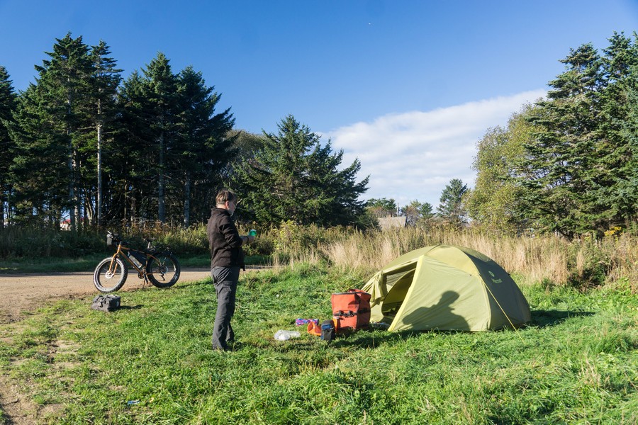На Сахалине мы уже неделю. Чувствуется наступление осени. Ночью мой сон был бодрым и свежим. Я впервые ощутил, что мне прохладно в спальнике. Ради экономии веса я взял в поездку довольно лёгкий и не слишком объёмный спальник Deuter Orbit. Спальник был старым, прошедшим ряд экспедиций прошлых лет и заявленные минус пару градусов экстрима уже не оправдывал, давая комфорт только при плюсовых температурах. Таня же была счастливой обладательницей тёплого пухового спальника, сжимавшегося до компактных размеров. К тому же у Тани был коврик Therm-a-rest, а я спал на тонком китайском каремате Eggnest, который мы ласково называли «гнездо для яиц». Поскольку я мужчина довольно тяжёлый, мой старый надувной коврик, не выдержав истязаний, лопнул где-то на Кавказе и ремонту не подлежал. На обновление снаряжения денег у меня не было. Другие же мои спальные мешки были либо слишком летними, либо чересчур громадными и никак не помещались в багаж. Пришлось довольствоваться тем, что есть. Хорошо, что по натуре я не мерзляк. К моменту, когда я пишу эти строки, я обзавёлся новым надувным ковриком и компактным пуховым спальником для холодных ночёвок. Всё-таки комфорт и здоровье оправдывают любые расходы.