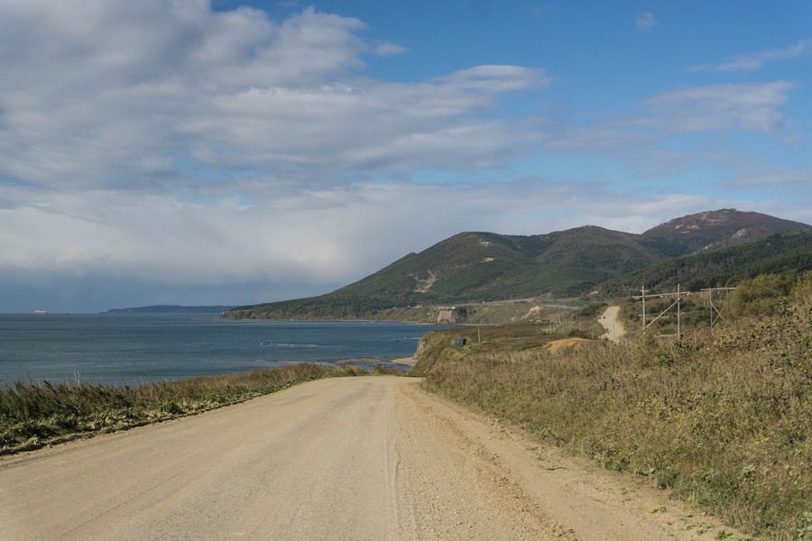 Ветер был крайне суров, особенно когда дорога вышла на морское побережье. Последние два километра до Озерского казались бесконечными. Поселок мелькал на горизонте белыми зданиями, но упорно не приближался. Ветер отнимал последние силы, лицо и руки замерзали, а когда мы наконец добрались, то побежали греться в первый попавшийся магазин.