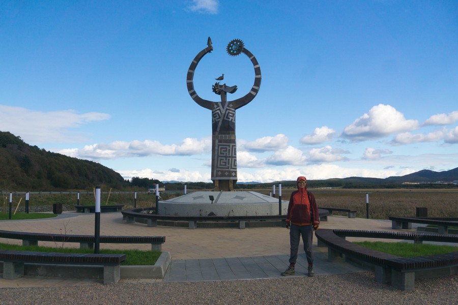 Не доезжая до Муравьево у дороги стоит еще один школьный павильон эпохи Карафуто — хоэнден наподобие того, что мы видели вчера у Новиково. Но этот павильон сохранился лучше и выглядит более нарядно. Ками были рады тому, что мы их проведали, атмосфера места очень умиротворяющая. На ступенях павильона мы пообедали и, так и не заехав в туристическое Муравьево, отправились в Озерское дальше сражаться со встречным ветром.