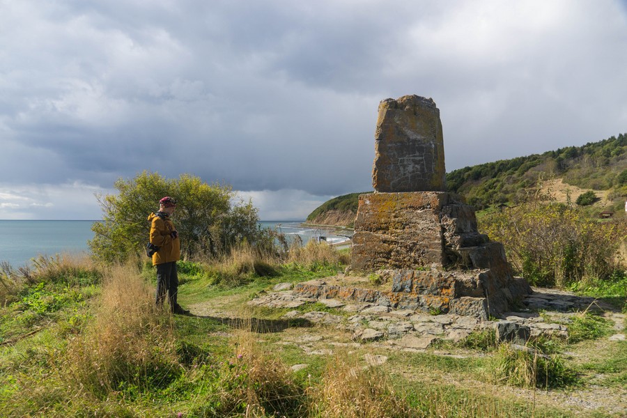 В 1926 году японцы установили на сопке памятный знак в честь высадки десанта. Стеллу сделали в виде трехгранного штыка, а на ней иероглифы, написанные рукой генерал-лейтенанта Ёсиэ Исисукэ, посвящённые майору Нисикубо. Тоёитиро Нисикубо — герой Русской-японской войны, который погиб во время захвата Южного Сахалина под селом Дальнее. Японцы почитали Нисикубо как ками (бога) и возводили в его честь храмы на Карафуто. От памятника-штыка сохранился лишь постамент и лестница, а взорванная в 1945 году стелла лежит рядом. Если подняться от стеллы чуть выше по склону, то можно обнаружить остатки синтоистского храма Нисикубо. От храмового места открывается вид на Анивский залив и завод.