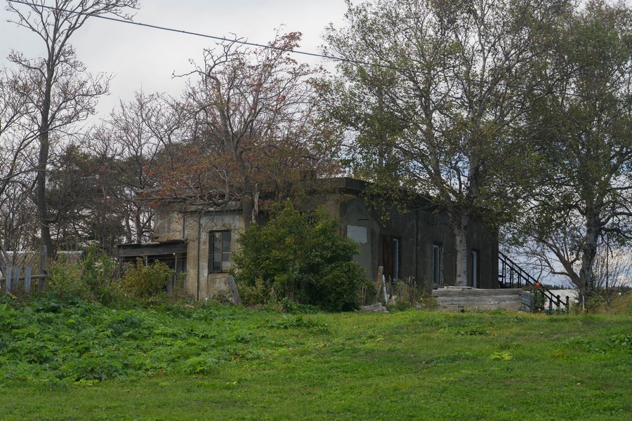 Тюконхи в Нагахаме так же, как и большинство японских монументов, сброшен с пьедестала, но уже давно, много десятилетий назад. Он лежит на земле иероглифами вверх. Я читал, что этот тюконхи был установлен в честь какого-то генерала. Рядом с пустым постаментом — полусгнивший стол, разваленные стулья и несколько пустых бутылок из под водки. В трёх метрах — покосившееся, вросшее в землю здание, в котором сегодня находится православный храм, или приходской дом. Как таковой, церкви в поселке нет, видимо, под неё временно приспособлено старое жилое здание. Замечаем среди мусора приметный куст — то ли можжевельник, то ли нечто ценное и экзотическое рядом с бывшим дзиндзя. Ками ещё не покинули это место, решаем мы и едем дальше.