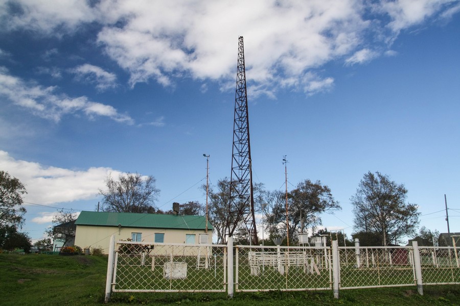 Метеостанция — локация не туристическая. Крохотный бетонный домик, ничем не примечательный, спрятан на вершине сопки среди неприглядного частного сектора. Только одним удивляет метеостанция — великолепной ажурной метеовышкой, проржавевшей за сто лет, но продолжающей уверенно стоять на своём основании. Но сколько еще отпущено ей судьбой — сказать сложно. Видно, что реставрацией этого места и уж тем более, превращением его в памятник истории и архитектуры никто особенно не озабочен. Мне Корсаковская метеовышка напомнила Шуховскую башню на московской Шаболовке, такую же ветхую и запущенную.